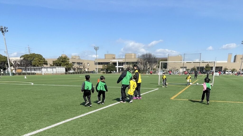 進めていく中で、指示が上手く通らなかったり、スムーズにいかなかったりする場面もありましたが、分かりやすく説明することや、優しくフォローすることで、子どもたちが夢中になって、サッカーをする姿を見ることができました。