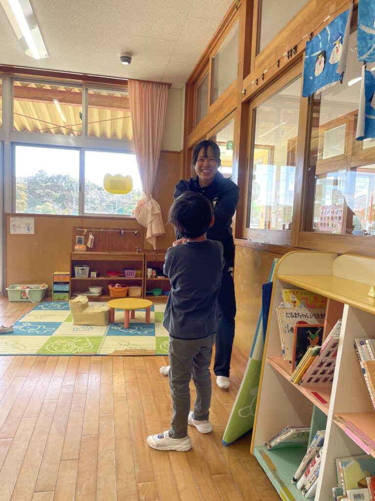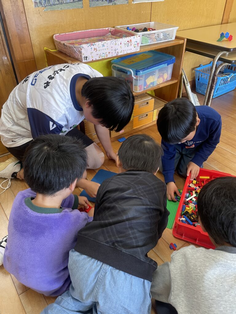 昨年同様、年長、年中、年少の3クラスに分かれて各年代の園児たちと1時間、遊びました。はじめは、選手たちの緊張があり、園児との距離感も掴めず、思うように関わることが出来ない様子も見られました。