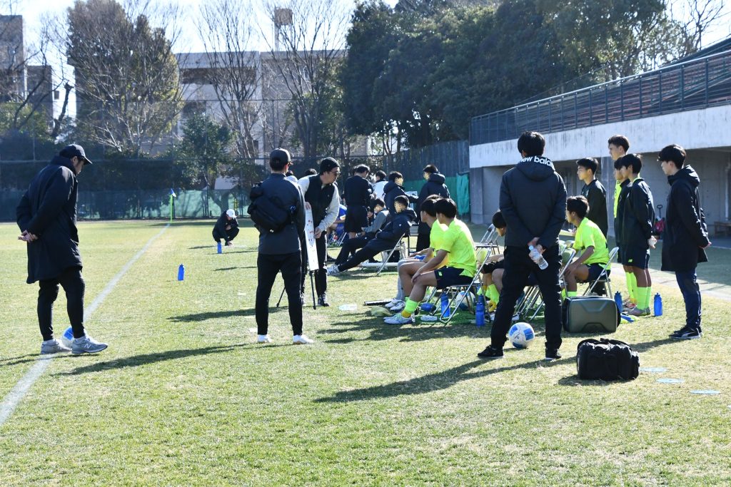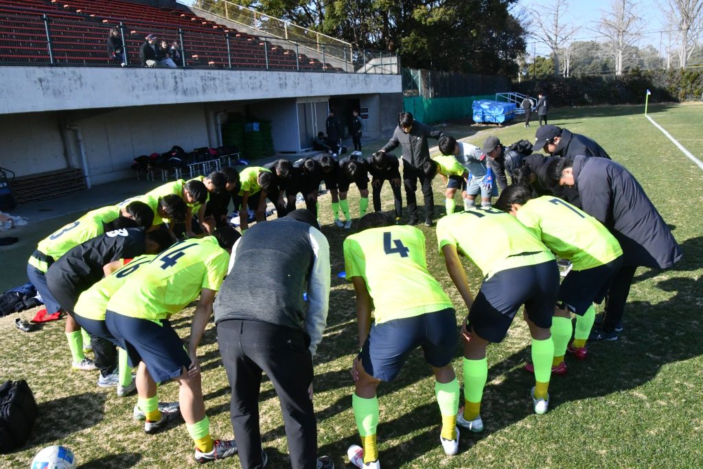 新年初の公式戦に少し緊張した面持ちで、選手たちはピッチに入っていきました。会場には志を同じくする仲間たちも、別の練習メニューに取り組んだ後、観覧席からピッチで闘う選手たちの雄姿を見守りました。